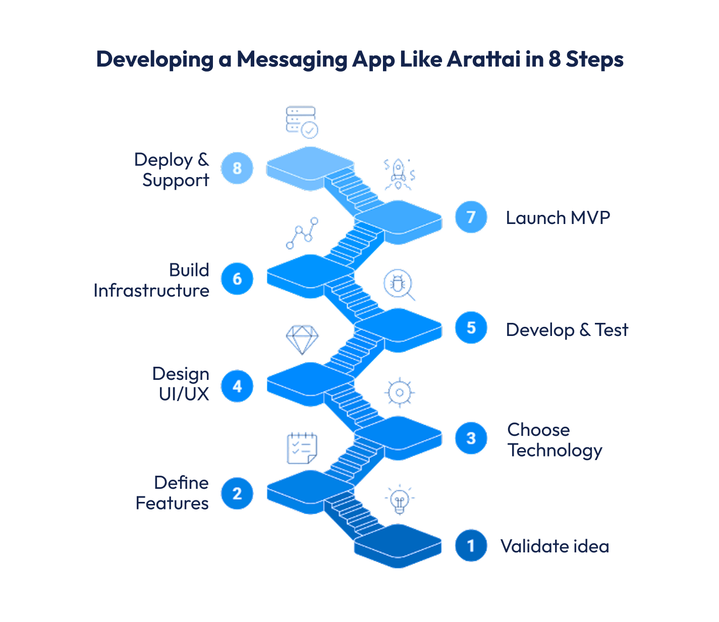 Strategy, design, and execution matter the most when you build a messaging app like Arattai or even WhatsApp. If you’re exploring how to build a chat app like Arattai, here’s how you can turn your idea into a full-fledged messaging app: