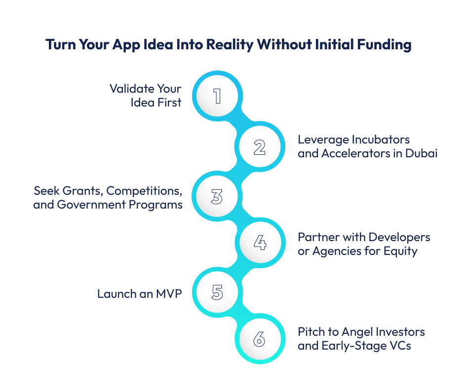 Having no capital doesn’t necessarily mean the end of an app idea. In Dubai’s thriving tech ecosystem, entrepreneurs can still move forward if they choose the right approach. Here are some practical steps: