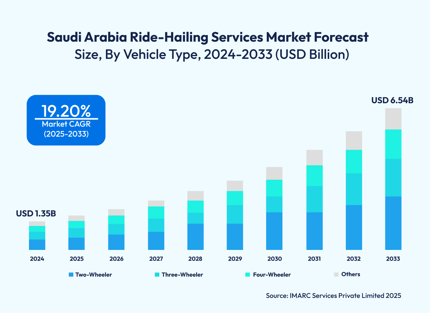 The ride-hailing industry in Saudi Arabia is booming. In 2024, the market reached USD 1.35 billion and is expected to hit USD 6.54 billion by 2033, growing at a CAGR of 19.2%.