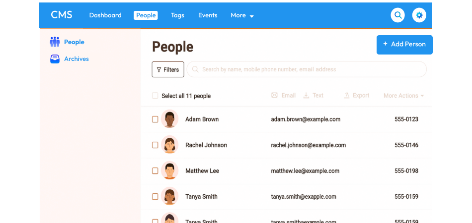 Church is all about building community and nurturing relationships. So, it is important for any software for church management to feature a customizable contact database. Using that database, you can easily find all members’ information in one place and customize it.